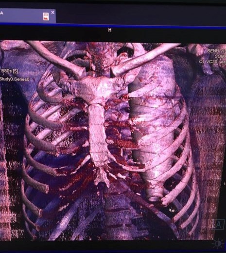Theo đó, trưa ngày 28-5, bệnh nhân N.H.B (53 tuổi, trú ở Quảng Nam) nhập viện sau khi ngã cầu thang, bị một dị vật chưa xác định đâm vào vùng lõm xương đòn và mắc trong ngực, gây khó thở. Ông B. được đưa vào cấp cứu tại BV trong trạng thái hoảng loạn, khó thở, đau tức ở vùng ngực.